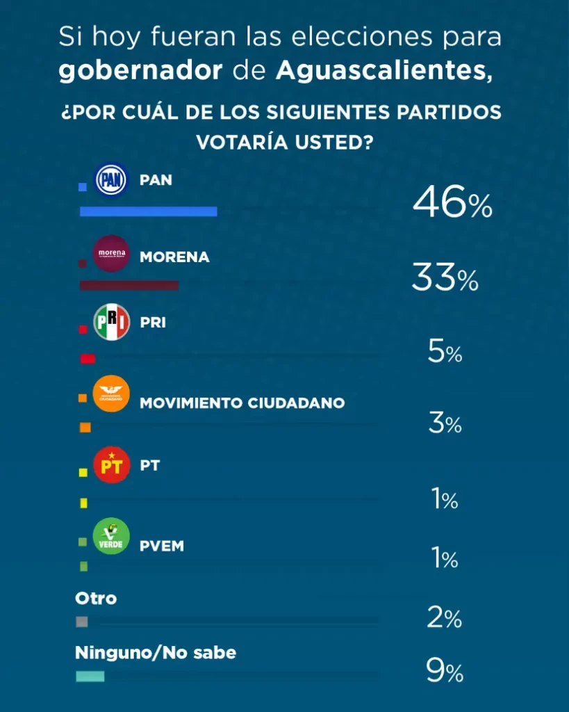 Si hoy se realizaran las elecciones para gobernador o gobernadora en Aguascalientes, el Partido Acción Nacional (PAN) sería el gran favorito, al obtener el 46% de la intención de voto.